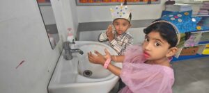 This activity was conducted on Wednesday, October 15. Children enjoyed a fun and interactive session on proper hand washing. They practised using liquid soap and water, rubbing their palms, fingers, and nails to make lots of bubbles. Through this playful activity, they learned the importance of washing their hands before eating, after playing, and after using the washroom—joyfully building good hygiene habits.