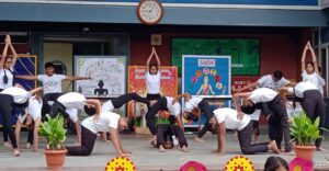 The students’ excitement reached its peak when contemporary music was presented on stage, creating a lively atmosphere. The programme concluded with a remarkable display of challenging Yogasanas, leaving the audience amazed by the students’ grace and flexibility.
